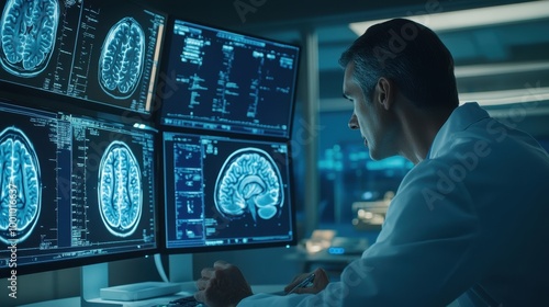 Medical Professional Analyzing Brain Scans on Multiple Monitors in a High-Tech Laboratory Setting
