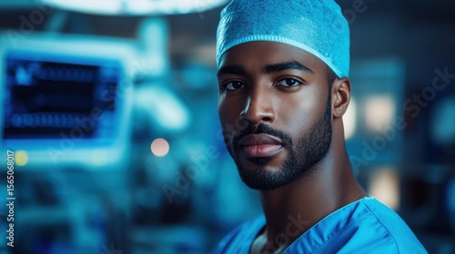 Medical professional in surgical attire looks thoughtfully at camera in a high-tech operating room