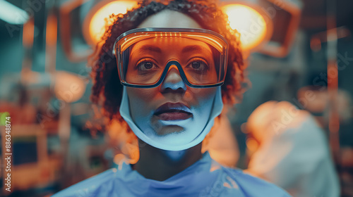 Medical professional using smart glasses for augmented reality surgery, realistic 3D models and digital transformation tools in a high-tech operating room.