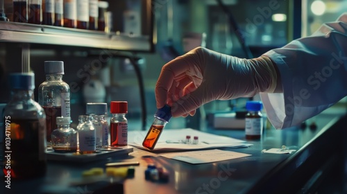 Medical scientist hand reaching for a vial of newly discovered compounds on a lab bench