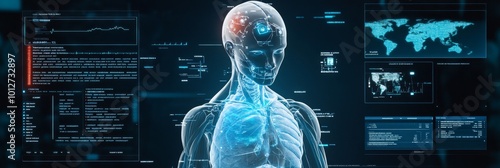 Medical Technology Interface on Desktop with Blue, showing a 3D model of the human body with highlighted brain and data on the computer screen.