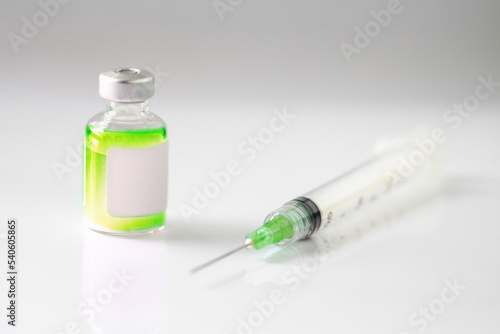 Medical vial of a neon green substance and hypodermic needle. Concept of drug addiction or toxic substance.