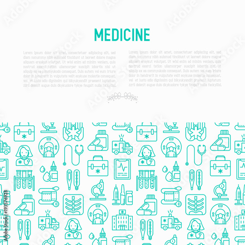 Medicine concept with thin line icons: doctor, ambulance, stethoscope, microscope, thermometer, hospital, z-ray image, MRI scanner, tonometer. Modern vector illustration for medical survey, report.