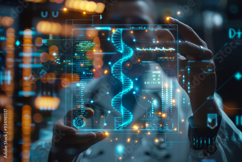 Medicine doctor holding blue helix DNA structure on hologram modern virtual screen interface and diagnose healthcare on digital network