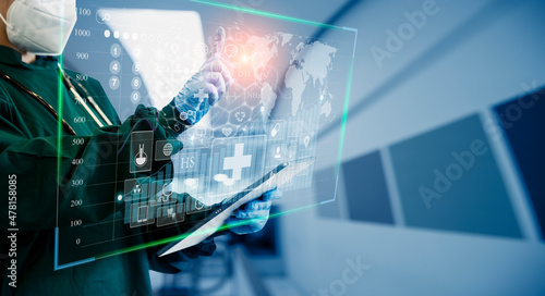 Medicine doctor using digital healthcare and network connection on hologram modern virtual screen interface icons, Medical technology futuristic concept.