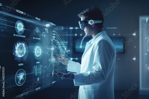 Medicine of the future. Healthcare technology and the networking concept. DNA. Digital health and networking on the hologram. Futuristic physician. Engineering and Medtech. Generative AI