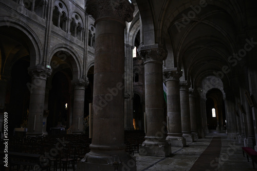 Medieval cathedral interior with stone pillars and vaulted ceiling