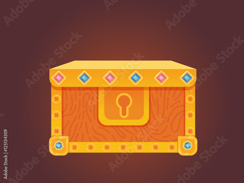 Medieval gold treasure chest illustration. Vector shiny game design element. With blue and pink gems inlay
