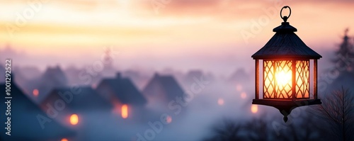Medieval village, covered in fog, soft lantern glow, 3D illustration