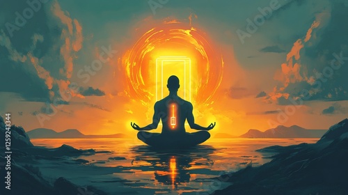 Meditating figure in a serene sunset, transcending into a luminous portal
