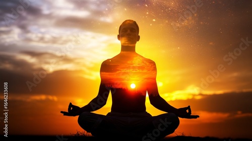 Meditating person at sunset, finding inner peace and balance, perfect for wellness and mindfulness projects, inspiring calm