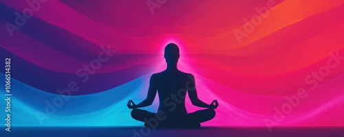 Meditation and mindfulness concept. A silhouette meditates against a vibrant colorful backdrop of pink and blue conveying tranquility and inner peace