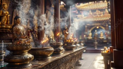Meditation and tranquility fill the air in a temple adorned with incense smoke and golden Buddha statues in a soft, glowing ambiance.
