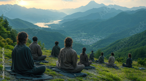 Meditation group practicing deep breathing on a hilltop, surrounded by a panoramic mountain view