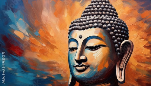 Meditative Oil Painting of a Stylized Buddha with Abstract Texture Background, Depicting Peace and Tranquility in Vibrant Colors