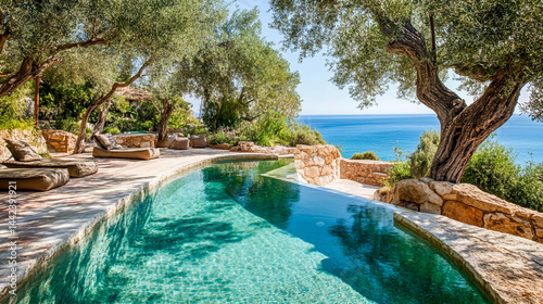 Mediterranean garden where ancient olive trees meet sparkling turquoise seas
