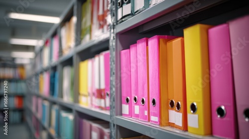 Medium shot of a compact shelving unit loaded with bulk stationery items front shelf sharply detailed remaining area softly blurred to underline organized office stock.