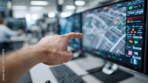 Medium shot of a control room monitor displaying AIpowered urban fleet scheduling with blurred operators in the background optimizing city delivery routes.