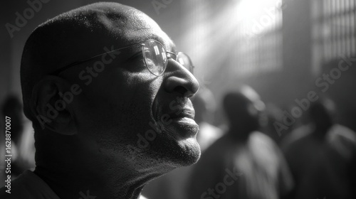 Medium shot of an inmate poet expressing emotion through words in a nighttime prison workshop with serene shadows blurring the surrounding walls and listeners.