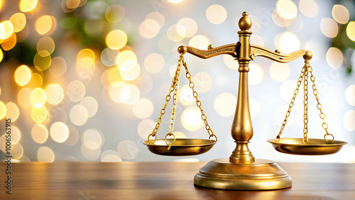 Medium Shot of Justice Scales in Bokeh Courtroom: Symbolizing Democracy's Delicate Balance Against Policy Issues - Ideal Stock Photo Concept