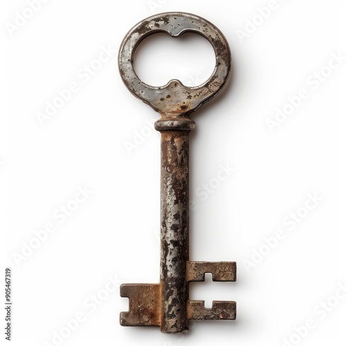 Medium shot of old key, isolated on a white background, bright and vivid tonality