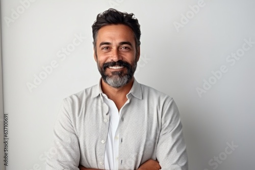 Medium shot portrait of an Indian man in his 40s in a minimalist background