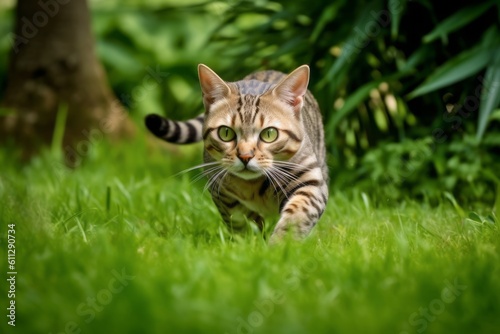Medium shot portrait photography of a bored bengal cat running against a lush green lawn. With generative AI technology