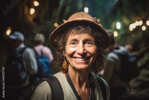 Medium shot portrait photography of a happy mature woman wearing a breathable mesh vest at the waitomo glowworm caves in waikato new zealand. With generative AI technology