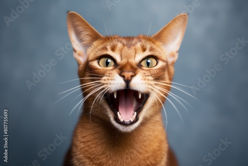 Medium shot portrait photography of a smiling abyssinian cat growling on minimalist or empty room background