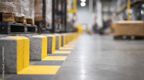 Mediumfocused view of modular containment berms being deployed on a factory floor with foreground in sharp focus and background blurred illustrating modern spill prevention