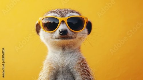 Meerkat sporting yellow sunglasses, posing confidently against bright yellow background with playful, whimsical charm