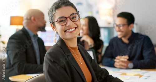 Meeting, happy and portrait of employee with team planning or working on strategy together in startup company. Corporate, confident and professional business woman at discussion in agency office