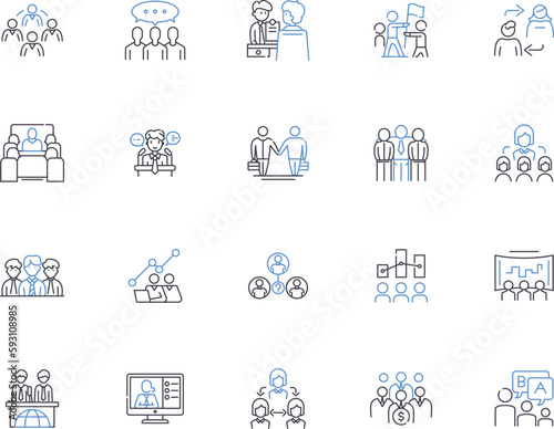 Meeting outline icons collection. Conclave, Conference, Forum, Gathering, Dialogue, Symposium, Rendezvous vector and illustration concept set. Assemblage, Caucus, Colloquy linear signs