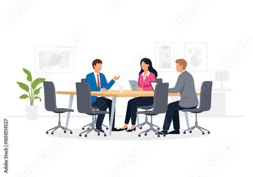 Meeting scene shows 3 seated professionals at a table in a bright office with artwork
