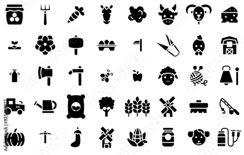 Mega Set Of Vector Farm Isolated Silhouette Solid Icons With Food,Farm,Animal,Tool,Farming Stroke Icon Collection. Vector Illustration