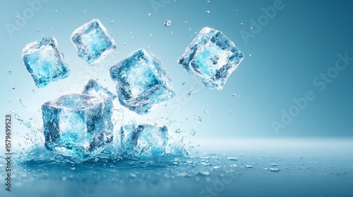 Melting ice cubes splashing in crystal clear water refreshing drink concept studio shot