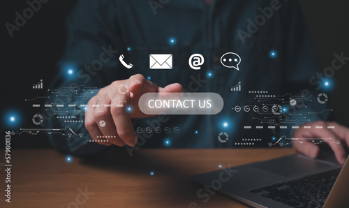 Men hand pointing finger and reach out for contact for customer service or purchase order from online shopping. Global marketing that allow business to connect with insight customer data