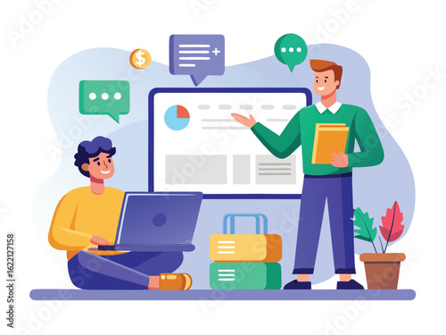 Men learning finance with laptop and presentation discussion