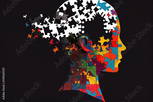Mental health, psychotherapy, strategy, logical brain and memory creative abstract concept. Human Head silhouette with jigsaw puzzle pieces. Mindfulness, thinking, self care idea.