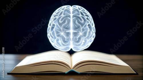 Mental Health Technology Education concept. A glowing brain above an open book symbolizes knowledge and creativity.