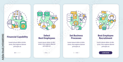 Merge teams successfully onboarding mobile app screen. Recruitment walkthrough 4 steps editable graphic instructions with linear concepts. UI, UX, GUI template. Myriad Pro-Bold, Regular fonts used