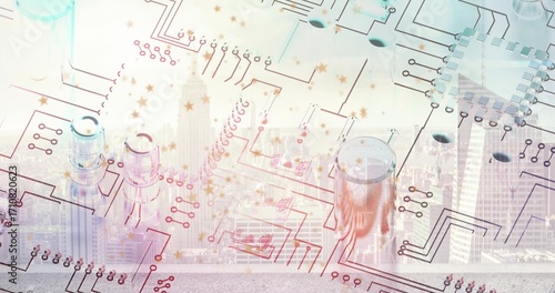 Merging schematic with city skyline showing IC chips, traces, capacitors, microchip die, sparkles