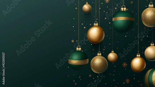 Merry Christmas and Happy New Year festive background. Realistic hanging green and golden Christmas balls. Xmas vector banner, social networks, web header