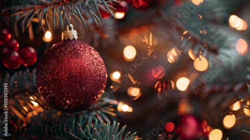 Merry Christmas and Happy New Year. Festive bright beautiful background. Decorated Christmas tree on blurred background. de-focused lights, gold bokeh