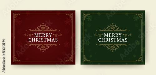 Merry Christmas luxury retro Victorian frame social media post design template set vector illustration. Winter holiday Xmas congratulations vintage royal golden border red green greeting card