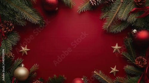 Merry Christmas red background decorated with happy 2022 new year tree branches and baubles stars, winter holiday card decorations festive merry concept, flat lay, above top view, copy space