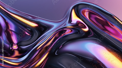 Mesmerizing abstract background with holographic liquid and gold particles, blending vibrant purple and blue colors in an iridescent wave for a modern and futuristic look