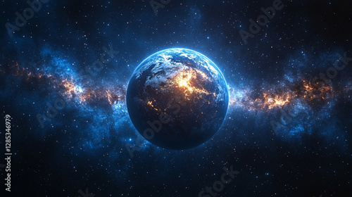 mesmerizing blue glow encircles planet Earth during an eclipse, set against the vast, starry dark space. The planet orbits a celestial body, creating a stunning cosmos display with bright, modern ligh