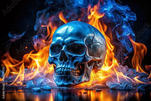 Mesmerizing Blue Skull Surrounded by Flames, Captivating Fire and Ice Contrast in Dark Background