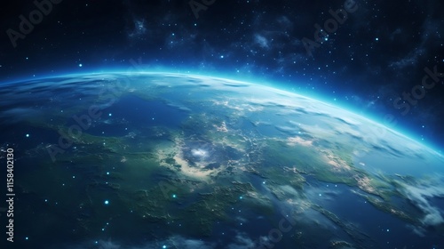 Mesmerizing close up view of planet Earth from outer space with the brilliant Milky Way galaxy glowing brightly in the vast cosmic background